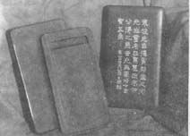 蘭亭硯 于1986年在縣政府大樓后出土。端石。長25.7厘米,寬16.3厘米,厚4厘米。出土時邊緣已破損。此硯鐫刻晉代書法家王羲之等人蘭亭集楔的故事,正面及四周共刻有人物26人,中間部分為蓄水鴨池,其余為曲水流觴、茂林修竹以及亭臺樓閣,均為薄雕或以線條簡略體現,背面通篇鐫刻《蘭亭序》全文。年代無考。觀其刀法似明、清遺物。
