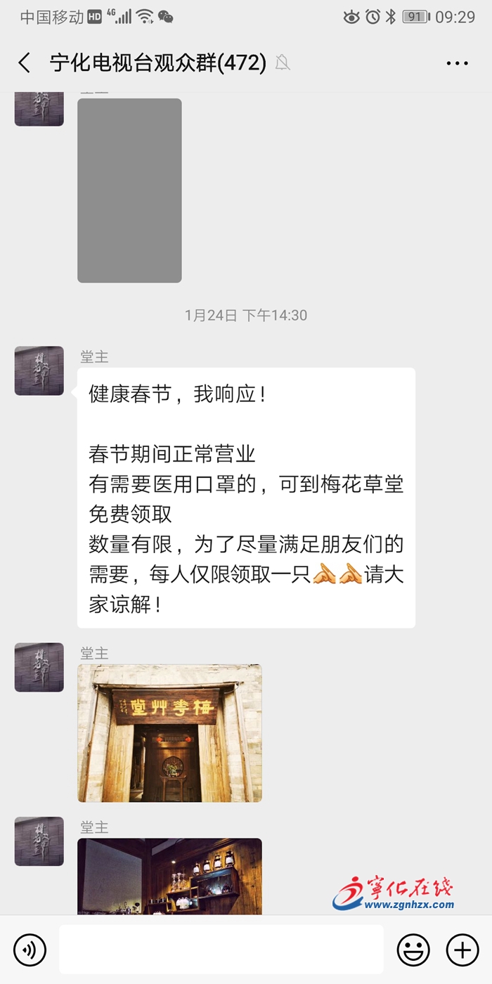 24日14時30分,“懶熊”聯系寧化縣翠江鎮水門巷梅花草堂的店主“堂主”,在寧化電視臺觀眾群里默默發出一條信息“健康春節,我響應,有需要醫用口罩的,可到梅花草堂免費領取,數量有限,每人限領一只,請大家諒解!”把家里儲備的200余個口罩向社會免費發放。