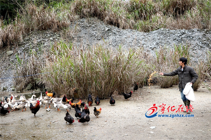 3月16日,寧化縣濟村鄉三村村貧困戶張清科站在山腳茅草叢邊,一陣呼喚過后,只見成群結隊的土雞、土鴨從密林間、草叢里飛奔而來,團團圍住他,爭先恐后地搶食他手中撒出的谷子和玉米。