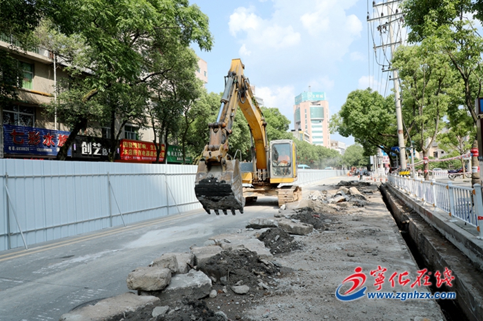 5月19日,在寧化縣城區南大街“白改黑”項目施工現場,挖掘機、切割機正不停運轉,工人們正進行道路病害處理、水溝蓋板置換等作業。