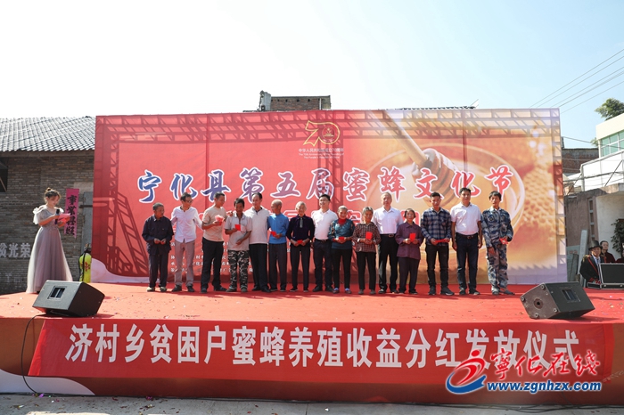 在三村黨支部的引領下,施河林為周邊村民提供引進新品種、蜂藥、蜂具、蜂食、蜂產品購銷等服務,開展養(yǎng)殖技術培訓、交流和咨詢等,不斷推行“互聯網+私人定制”模式,讓濟村的蜂蜜向個性化發(fā)展。通過發(fā)展養(yǎng)蜂產業(yè),會員獲得分紅或勞務收入,人均增收3000多元。2015年以來,施河林連續(xù)籌辦五屆蜜蜂文化節(jié),帶動養(yǎng)蜂產業(yè)的發(fā)展。2019年10月,三村如期舉辦第五屆蜂蜜文化節(jié)暨電商扶貧助農簽約儀式,10名參與蜂群代養(yǎng)的農戶喜獲合作社收益分紅,6家電商企業(yè)與東華山養(yǎng)蜂專業(yè)合作社簽約,就建檔立卡貧困戶的蜂產品及其它農特產品的銷售達成合作協議。