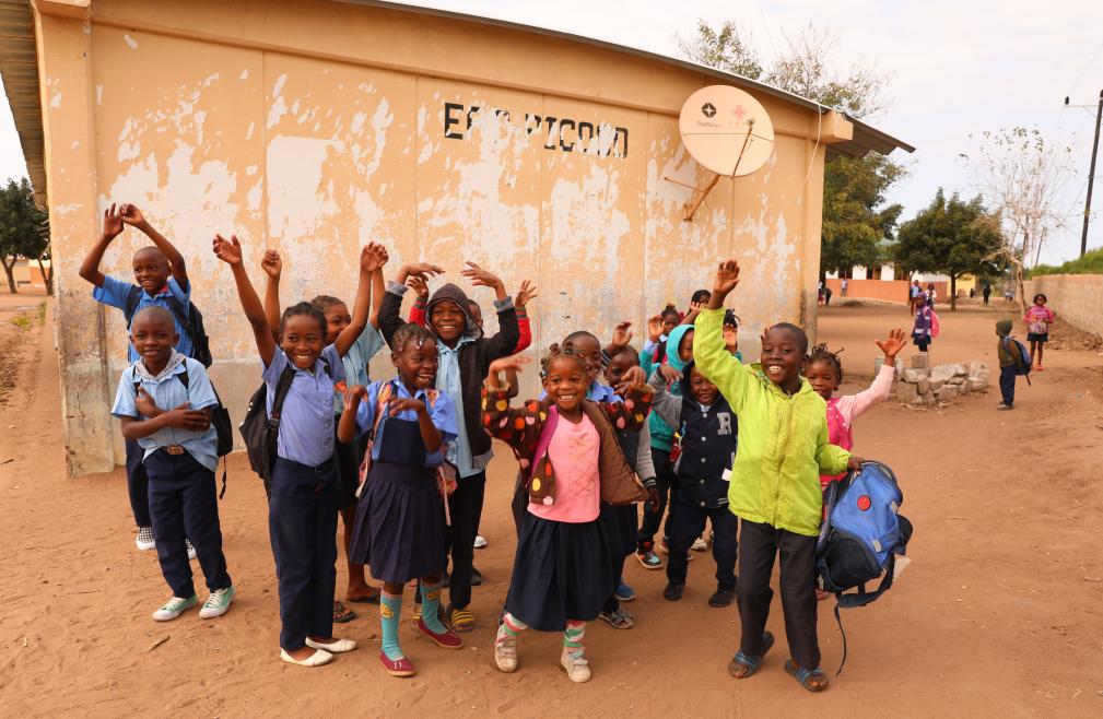 中國援非“萬村通”項目旨在為上萬個偏遠村莊接入衛星電視信號,助力非洲民眾聯通世界,是中非合作的重要舉措和共建“一帶一路”民心相通的重要成果。這是2023年7月25日,莫桑比克馬普托省皮科科村學校的孩子們站在裝有中國援助的衛星電視接收天線的房屋前。新華社記者董江輝攝