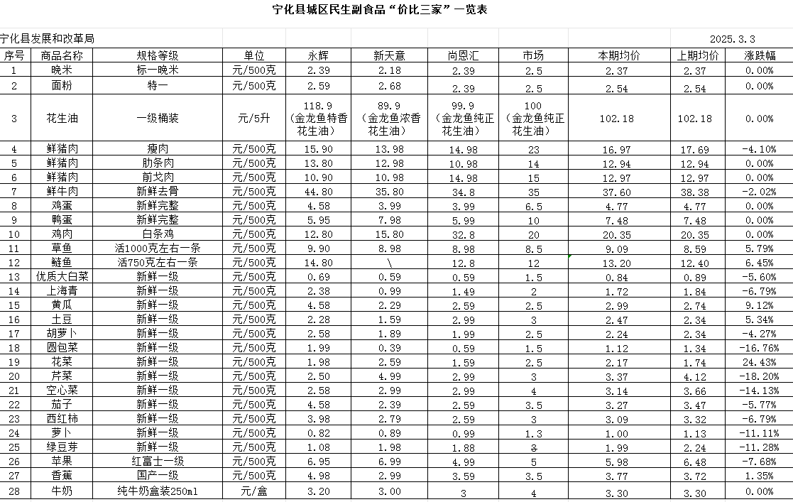 寧化縣城區民生副食品“價比三家”一覽表 (2025.3.3)