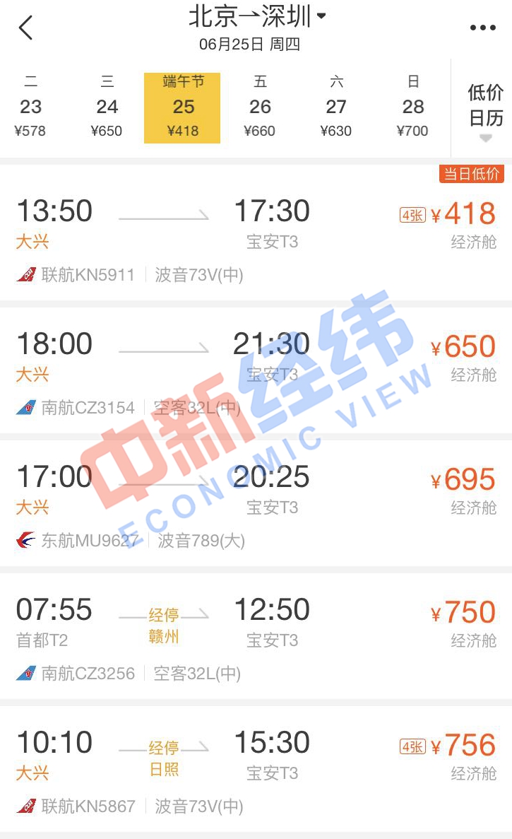 面對即將到來的端午節(jié)假期,即使沒有買到高鐵票也沒關(guān)系。通過第三方售票平臺發(fā)現(xiàn),端午節(jié)當(dāng)天,北京到多個城市的機(jī)票價格比高鐵還實惠,個別航班甚至便宜超一半。