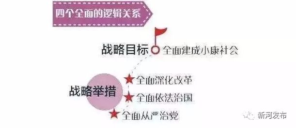 “四個全面”戰略布局不是簡單的并列、平行關系,而是一個有機聯系、環環相扣的整體。從大的關系看,是目標引領舉措。全面建成小康社會是戰略目標,全面深化改革、全面依法治國、全面從嚴治黨是一個都不能缺的三大戰略舉措,為全面建成小康社會提供動力源泉、法治保障和政治保證。從每一個“全面”之間的具體關系看,也都是彼此聯系的。全面深化改革,既為全面建成小康社會提供強大動力,也是全面依法治國、全面從嚴治黨的需要。全面依法治國,本身就是全面建成小康社會的重要內容,同時又為全面建成小康社會提供法治保障,無論全面深化改革、全面從嚴治黨,都需要在法治的軌道上、框架下來進行。全面從嚴治黨,是推進“四個全面”戰略布局的關鍵,全面建成小康社會、全面深化改革、全面依法治國,都必須堅持黨的領導。