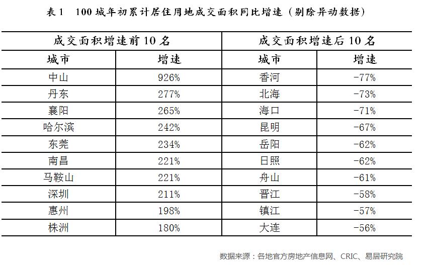 報告顯示,從全國百城居住用地成交面積的排序情況看,中山同比增速高達926%,與其他城市大幅拉開差距,丹東、襄陽3個城市同比增速超過了200%的水平;香河、北海、海口成交面積跌幅靠前,跌幅均超過70%。