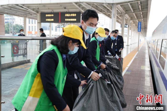 11月1日,工作人員正在南昌站站臺運送高鐵快運包裹。 胡燕 攝
