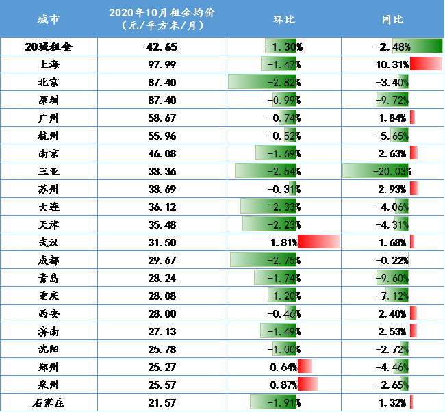 表:全國大中城市2020年10月份租金均價及同環比變化幅度