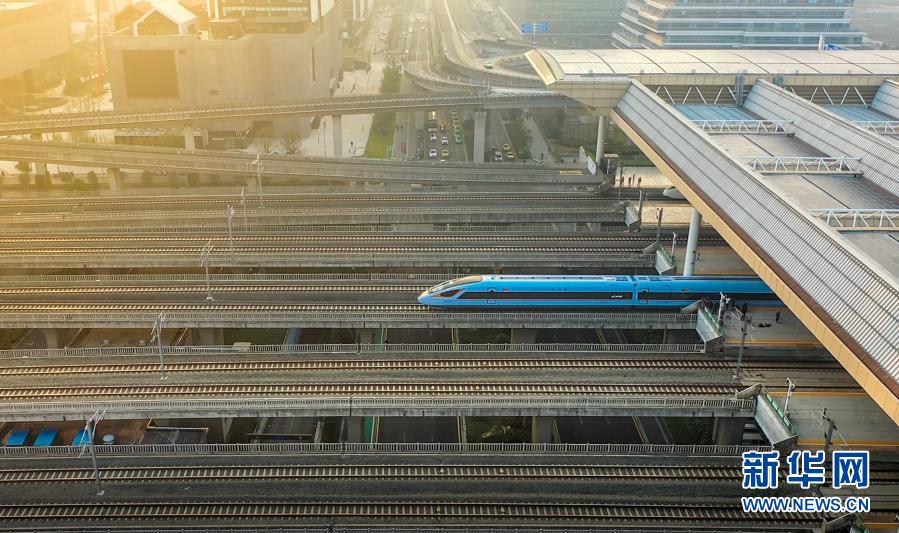 12月24日,由CR300BF型“復(fù)興號(hào)”動(dòng)車組擔(dān)當(dāng)?shù)腃3887次列車駛出南京南站(無(wú)人機(jī)照片)。新華社發(fā)