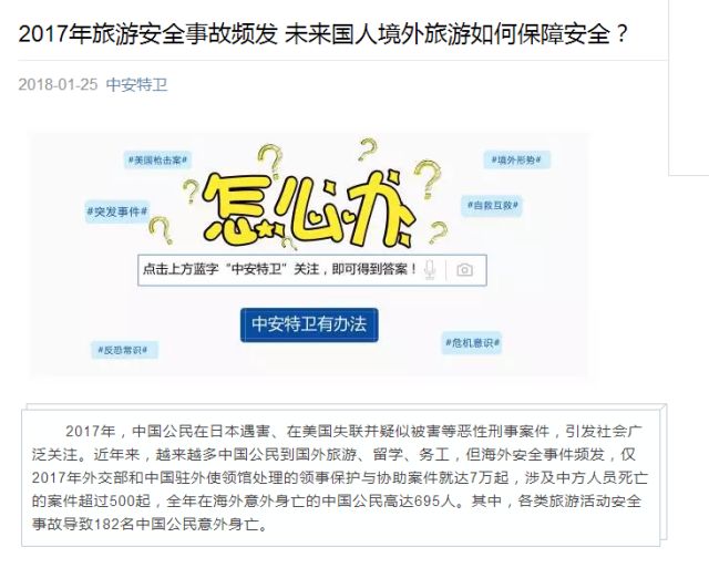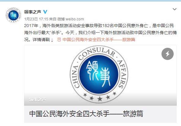 1月23日,外交部領事保護中心的官方微博《領事之聲》刊發了一篇官方文章,內容是提醒中國公民在旅游時應注意的安全防范問題。文中列舉了2017年中國公民在海外旅游時遇到的種種問題,最后向廣大游客提出了三條建議。
