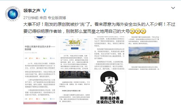 這兩天,正當網絡熱議“六神磊磊PK周沖”、痛斥“洗稿”現象的時候,驚發現,原來洗稿受害者絕不只是民間高手,官方機構也有“被傷害”的。這不,就在昨天,一向負責維護中國公民海外安全和合法權益的專門機構-外交部領事保護中心,也被強行抄“洗”了。