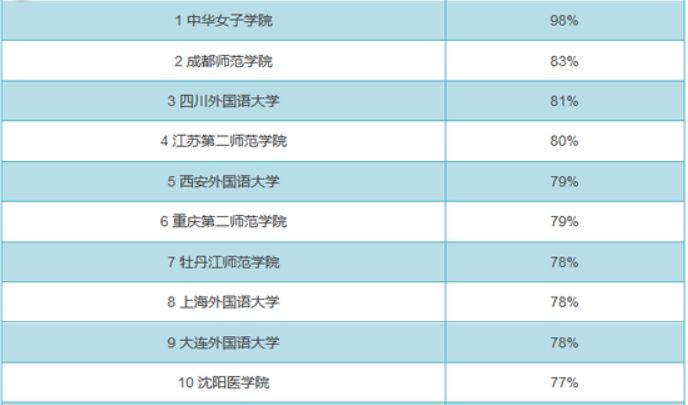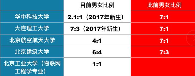 2015年,中國高校新媒體聯盟發布了全國719所高校男女比例排行榜:前十名中,4所師范類院校和4所外國語大學赫然在列。相反,排在榜單后10名的高校中,除1所刑事學院、2所體育院校外,其余7高校均為理工類大學。