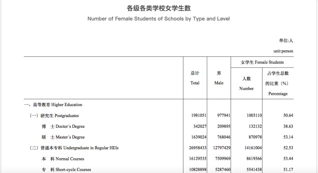 據中國教育部統計,自2009年普通本專科女生比重首次超過男生后,男女生數量差距越來越大。2016年,全國本科女大學生人數,比男生多出了111萬,碩士研究生中,女生比男生多了10萬。