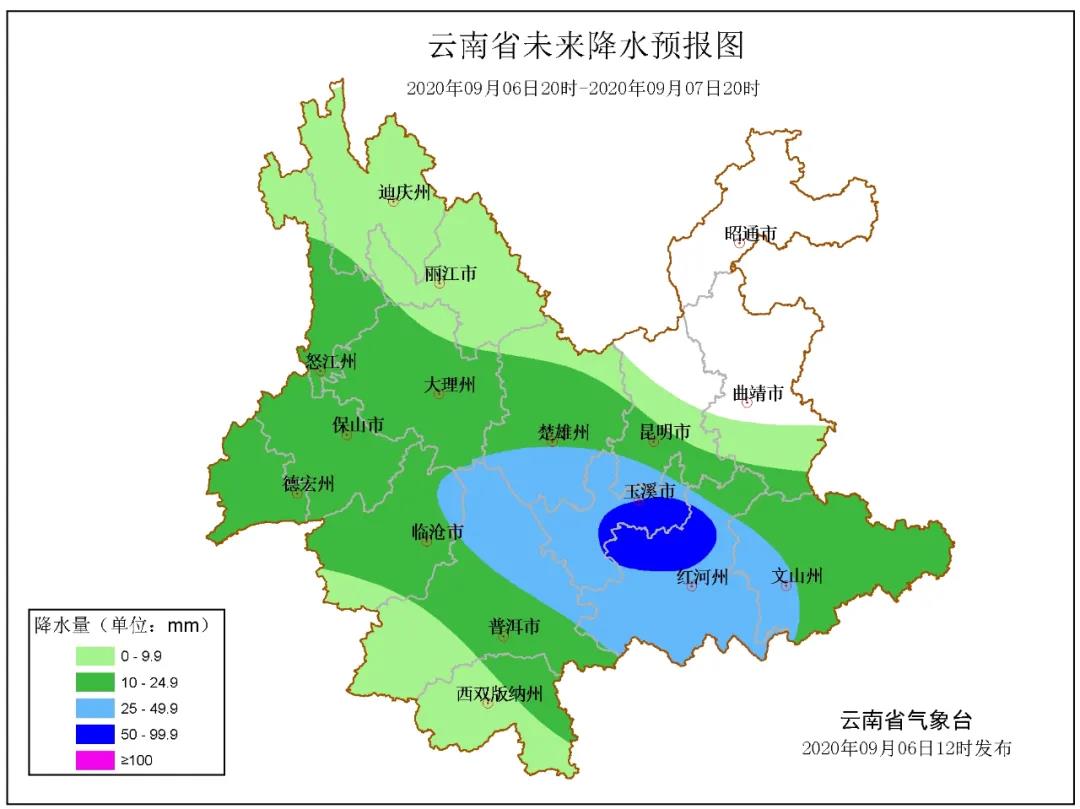 預計9月6日20時至9月7日20時:楚雄南部、玉溪、紅河、文山西部、普洱東部陰有大雨局部暴雨或大暴雨,文山東部、昆明南部、楚雄中部、普洱中部、西雙版納東部、大理、怒江南部、保山、德宏、臨滄陰天間多云有中到大雨局部暴雨,昭通、曲靖北部、昆明北部多云,其它地區多云間陰有小到中雨局部大雨。