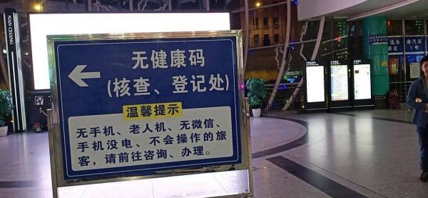針對(duì)老人機(jī)、無微信及手機(jī)沒電、不會(huì)操作、無健康碼等特殊人群,南昌站和南昌西站在出站口設(shè)置相關(guān)專用通道,并附溫馨提示。鄒嫻婧 攝