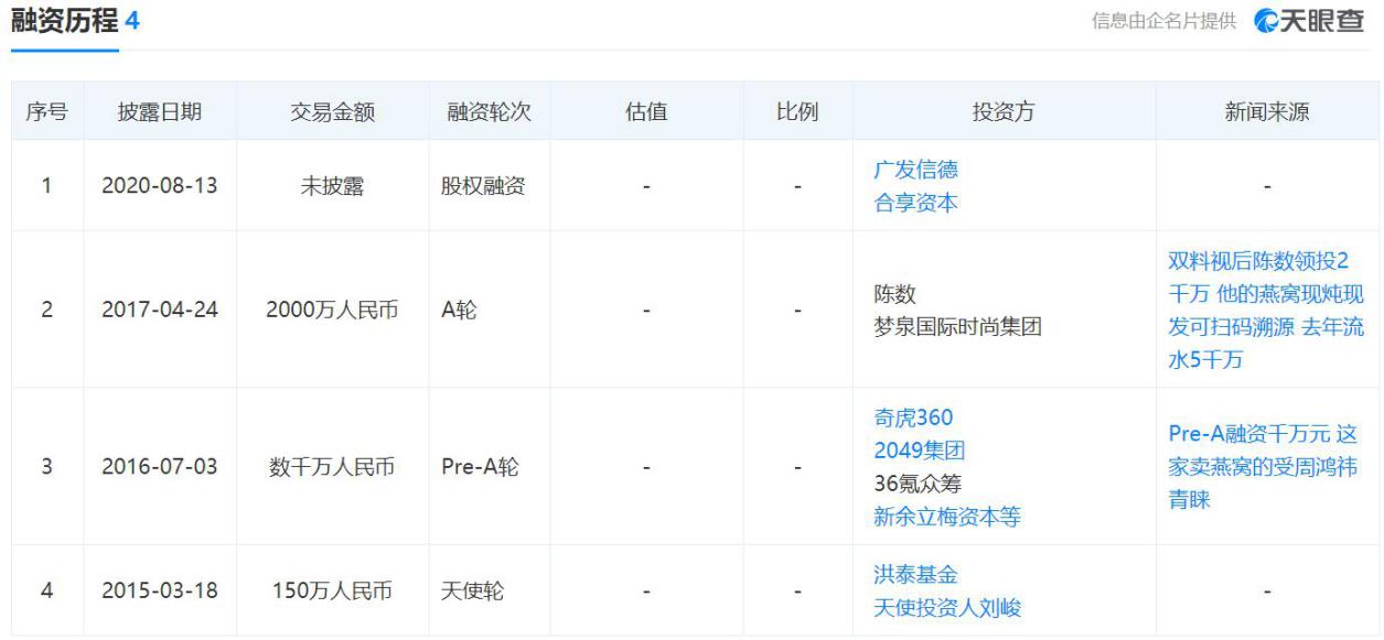 資本也看好燕窩行業(yè)的發(fā)展。以網紅燕窩品牌小仙燉為例,據(jù)天眼查,小仙燉背后所屬公司為深圳市榕樹堂生物科技有限公司,該公司成立于2012年7月19日,法定代表人為林小仙。目前,小仙燉已完成四輪融資,投資人包括洪泰基金、奇虎360、2049集團、知名演員陳數(shù)等。
