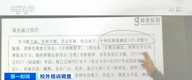 很多家長都會為孩子參加“早早培”準備簡歷,在某家長群中,記者看到了這樣兩份學齡前兒童的簡歷。第一個孩子不但可以完成百以內加減乘除混合運算、就讀某機構奧數最高班型創新班,還通過了英語劍橋KET考試、認識2000個漢字,即使這樣也并沒有通過海選;而另外一位水平基本相當的孩子則通過了海選,其中的原因就在于,后一位在中科院智商測試中,得到了145。