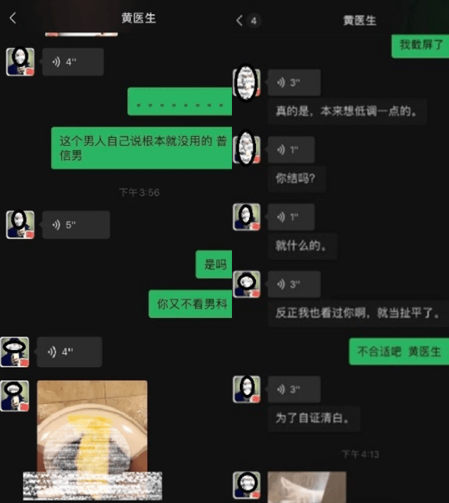 小魚在網帖中稱,2021年5月7日,她發了一條朋友圈,該男醫生又找其聊天,并在聊天中對其性騷擾。網帖出示的微信聊天截圖顯示,備注為“黃醫生”的用戶在語音中說,“你的胸長得很漂亮”“反正我也看過你啊,就當扯平了”。此外,“黃醫生”還發了疑似他自己下體的不雅照片。