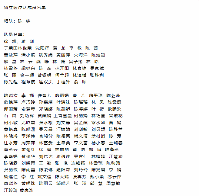我省此批援助湖北的2支醫(yī)療隊共277人。其中,福建省立醫(yī)院選派臨床醫(yī)師37名,護理人員100名,行政保障人員1名,由省立醫(yī)院副院長、省急救中心主任陳鋒擔任領隊,醫(yī)院院辦副主任徐凱、金山醫(yī)院醫(yī)務部負責人蔣劍為聯(lián)絡員。福建醫(yī)科大學附屬協(xié)和醫(yī)院選派臨床醫(yī)師37名,護理人員100名,行政保障人員2名,由福建醫(yī)科大學附屬協(xié)和醫(yī)院平潭分院副院長張尉擔任領隊,醫(yī)務部副主任魏琴為聯(lián)絡員。