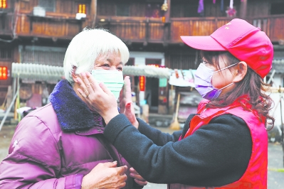 南靖縣書洋鎮(zhèn)志愿服務隊到楓林村示范口罩的正確戴法。福建日報記者林輝 通訊員 謝威 賴林青 攝