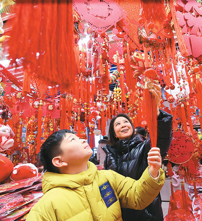 一名家長帶著孩子在北京市天豐利生活用品市場選購新年飾品。陳曉根 攝(人民視覺)