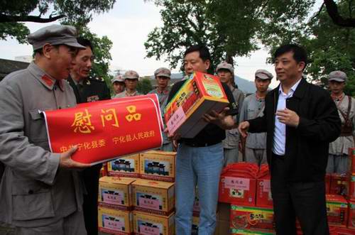 根據(jù)省委宣傳部統(tǒng)一安排,414日下午,受市委書記黃琪玉、市長劉道崎委托,市委常委、宣傳部長徐錚率領(lǐng)市委宣傳部和寧化縣慰問團來到長汀拍攝現(xiàn)場,代表市委、市政府向攝制組贈送“共和國搖籃、紅土地情懷”的錦旗和慰問品,并向攝制組人員介紹了三明市情和三明七個中央蘇區(qū)縣為中國革命勝利作出的巨大犧牲和偉大貢獻?!豆埠蛧鴵u籃》總導演金韜、編劇兼總制片邵鈞林出席了慰問儀式。