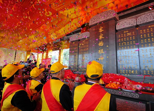 ??? 12月2日,來自各地的客家后裔在祭祖大典現(xiàn)場祭拜客家始祖。新華社記者 魏培全 攝