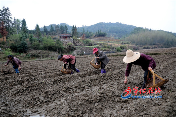 3月11日,寧化縣安遠鎮硝坊村200畝的種植基地上,村民正在翻土起壟,搶晴種植檳榔芋。