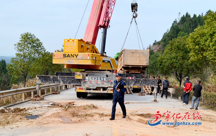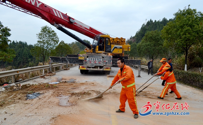 當(dāng)天下午14時(shí)10分許,在起重吊車到達(dá)現(xiàn)場(chǎng)之后,寧化公路中心路產(chǎn)工作人員和肩頭嶺班站工人立即在道路兩側(cè)按規(guī)范擺放警示標(biāo)志,并安排人員協(xié)助維持交通秩序,方便吊車作業(yè)。在起吊作業(yè)完成后,養(yǎng)路工人又緊急投入到路面清理當(dāng)中,經(jīng)過近70分鐘的緊張作業(yè),該路段恢復(fù)了暢通。