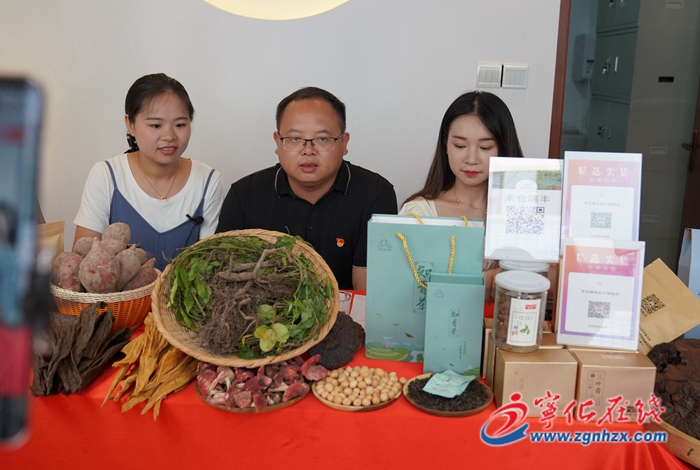 9月2日,在水茜鎮樂農電商展示中心的直播間內,兩位主播正向觀眾介紹三葉青、靈芝、紅菇等當地特色農副產品,并不時回答網友提問,直播期間氣氛熱烈。