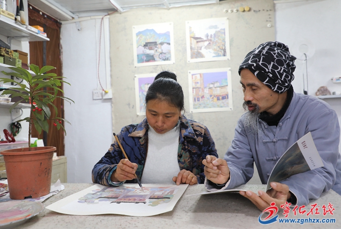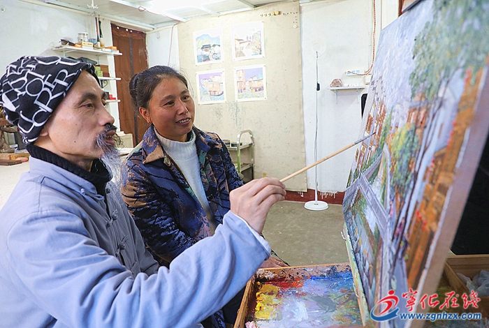 1月10日,寧化縣翠江鎮南街小巷內一幢民房內,一股濃烈的藝術氣息撲面而來,客廳的墻壁上懸掛著一幅幅精美的畫作,令人目不暇接。燈光下,畫家張秋榮正在創作工筆畫《寧陽古街》。她時而沾墨點翠,時而著色上彩,站在她旁邊的丈夫伊賢彬則不時給予指導。