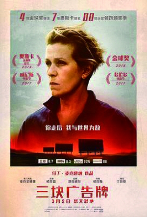 回到《三塊廣告牌》,雖然上映11天總票房只有4000多萬,但這并不能降低這部作品的藝術價值。這樣一部劇情片,相比于國內的某些小眾“文藝片”來說,其藝術水準是國內很多電影難以望其項背的。如果將其作為文藝片對待,那么這個票房總量也應該是不錯的成績。《三塊廣告牌》已經上映了多日,相關的評論已經很多,但筆者的關注點并不在于電影的一些所謂社會意義等,由于彼此的社會現狀并不相同,有些東西對比起來并沒有太大的意義。說到這里,還是要簡單敘述一下劇情,故事是一個美國的普通小鎮,并不繁盛,甚至有些荒涼和衰頹。一位單親母親米爾德里德的女兒被人奸殺,但是警察始終不能破案。忍無可忍的母親租下了3塊路邊的廣告牌,用大字寫上了當地警長的名字,質問他什么時候能破案。廣告牌在當地引發軒然大波,也造成了警方很大的壓力。與此事件相關的人都被卷進了漩渦之中,原本平靜的小鎮變得躁動不安。最終原來就已經診斷出患有癌癥的警長飲彈自盡,租用廣告牌的米爾德里德也招致巨大的壓力。但倔強的米爾德里德強硬地選擇繼續抗爭……
