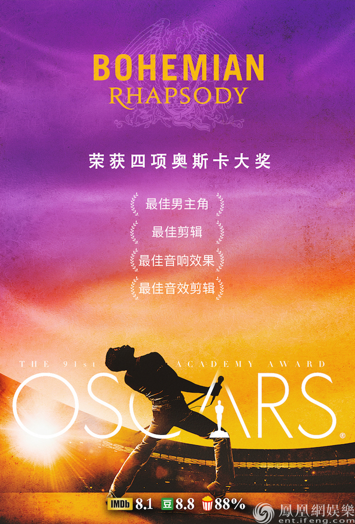 除此之外,在此前的第76屆金球獎(jiǎng)上,《波西米亞狂想曲》已獲劇情類(lèi)最佳電影獎(jiǎng),男主角拉米·馬雷克獲得劇情類(lèi)電影最佳男主角。作為一部關(guān)于世界樂(lè)壇傳奇“皇后樂(lè)隊(duì)(QUEEN)”的電影,《波西米亞狂想曲》自上映以來(lái)便大受影迷、樂(lè)迷歡迎,目前影片全球票房累計(jì)突破8.5億美元,創(chuàng)下2018年全球票房排行榜第14位的好成績(jī)!