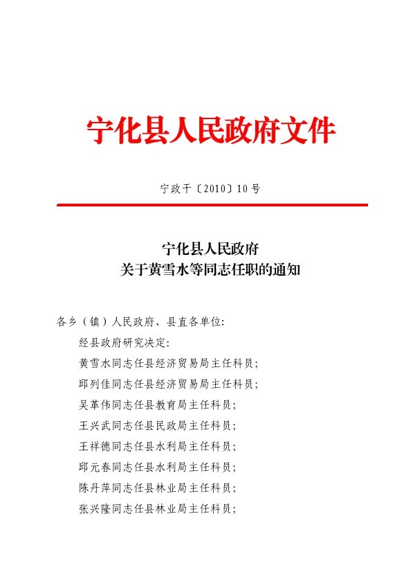 寧化縣人民政府關于黃雪水等同志任職的通知