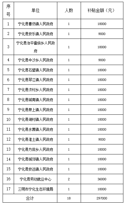 根據《三明市人力資源和社會保障局關于分解下達2020年度高校畢業生就業相關任務指標的通知》(明人社〔2020〕250號)、《寧化縣人力資源和社會保障局關于公開招聘2020年公共管理和社會服務崗位的通知》(寧人社〔2020〕106號)文件精神,經對申報單位及人員享受條件進行比對復核,符合補貼申報條件用人單位17家,符合補貼崗位數18個,擬補貼金額共計297000元,現擬對符合補貼條件的用人單位及具體補貼金額進行公示(具體情況詳見附件)。公示時間為期7天:2022年8月4日-8月10日,歡迎群眾監督,對公示內容如有異議,可通過公示電話或來信來訪進行反映。電話:6823905(縣人社局辦公室)。