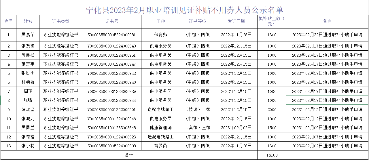 根據(jù)《三明市就業(yè)補(bǔ)助資金管理實(shí)施辦法的通知》(明財(cái)社〔2019〕46號)、《三明市人力資源和社會保障局關(guān)于印發(fā)<通過微信辦理就業(yè)服務(wù)有關(guān)事項(xiàng)實(shí)施辦法>的通知》(明人社〔2020〕46號)、《三明市人力資源和社會保障局辦公室關(guān)于拓寬實(shí)名制登記范圍的通知》(明人社辦〔2020〕57號)、《三明市就業(yè)工作領(lǐng)導(dǎo)小組辦公室轉(zhuǎn)發(fā)福建省就業(yè)工作領(lǐng)導(dǎo)小組辦公室關(guān)于過渡期職業(yè)技能培訓(xùn)有關(guān)工作的通知》(明人社〔2022〕24號)、《三明市人力資源和社會保障局關(guān)于公布三明市2022年部分急需緊缺職業(yè)(工種)目錄的通知》(明人社〔2022〕72號)文件精神,經(jīng)寧化縣勞動就業(yè)中心初審、我局復(fù)審以下共13人符合享受職業(yè)技能見證補(bǔ)貼標(biāo)準(zhǔn),現(xiàn)予以公示,公示時(shí)間為期7天:2023年3月6日- 3月12日,歡迎群眾監(jiān)督,對公示內(nèi)容如有異議,可通過公示電話或來信來訪進(jìn)行反映。電話:6823905(縣人社局辦公室)、6659221(派駐財(cái)政紀(jì)檢組)。
